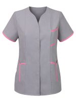 Damenbluse mit dekorativem V-Ausschnitt, kurze Ärmel. Ärmel und Taschen in Kontrastfarbe.
