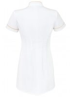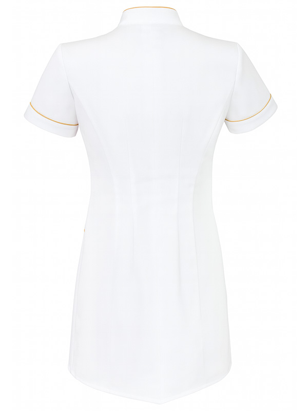 Schürze mit Stehkragen und kurzen Ärmeln. Asymmetrischer Verschluss mit verdeckten Federn. Abnäher, die die Silhouette formen.