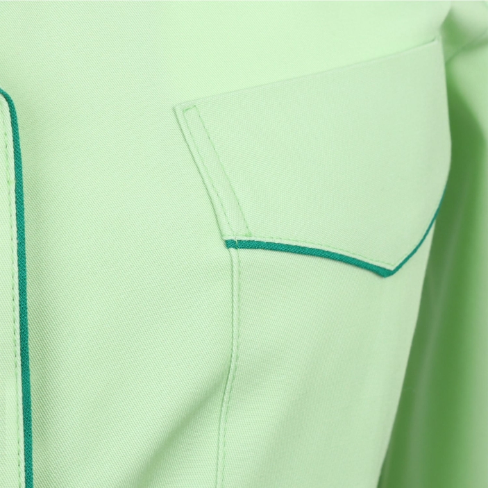 Bluza damska, kołnierz wykładany, długi rękaw, kieszonki dwie dolne oraz górna na lewej piersi. Wykończony wypustką kołnierz, wzdłuż zapięcia oraz kieszonki. Zapinany na springi.