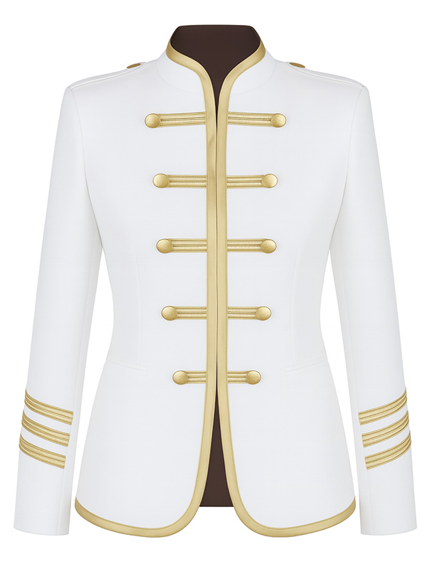 Elegancki żakiet damski z pagonami. Całość ozdobiona złotymi dodatkami. Przód zapinany na zamek. Model lekko dopasowany. Całość podszyta podszewką w kolorze dobranym do tkaniny.