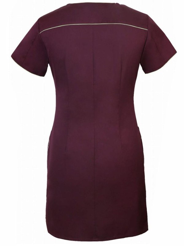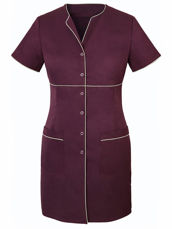 Fartuch damski bez stójki, krótki rękaw, z odcięciem pod biustem. Kontrastowa wypustka wzdłuż zapięcia, na stójce, rękawach, kieszonkach oraz odcięcie.