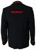 Marynarka męska klasyczna z kołnierzem wykładanym, zapinana na guziki ozdobne. Kontrastowe wykończenia w innej kolorystyce oraz ozdobnej złotej taśmie przy rękawach, kołnierzu oraz patkach przy kieszeniach dolnych oraz górnej kieszonce na lewej piersi.