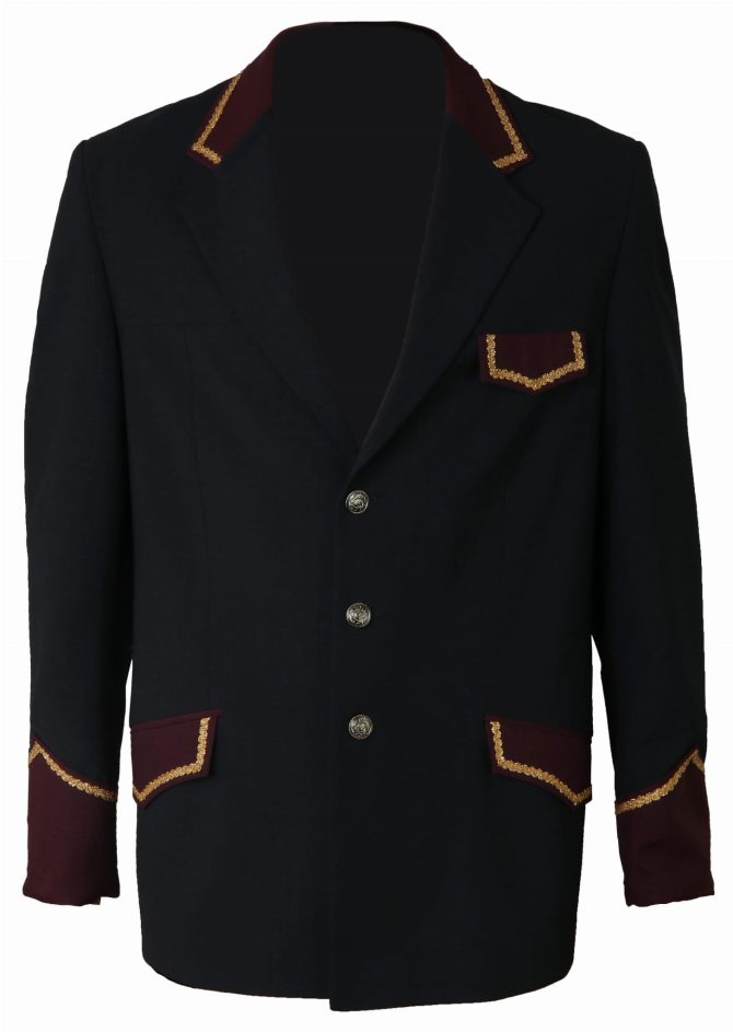 Marynarka męska klasyczna z kołnierzem wykładanym, zapinana na guziki ozdobne. Kontrastowe wykończenia w innej kolorystyce oraz ozdobnej złotej taśmie przy rękawach, kołnierzu oraz patkach przy kieszeniach dolnych oraz górnej kieszonce na lewej piersi.