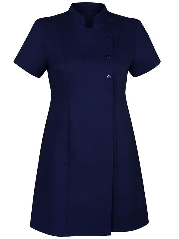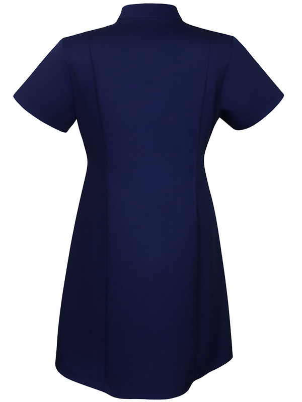 Fartuszek damski na stójce z asymetrycznym zapięciem. Krótki rękaw. Zapinany na 3 springi w kolorze sukienki, dalsze zapięcie kryte springi. Zaszewki w pasie modelujące sylwetkę.
