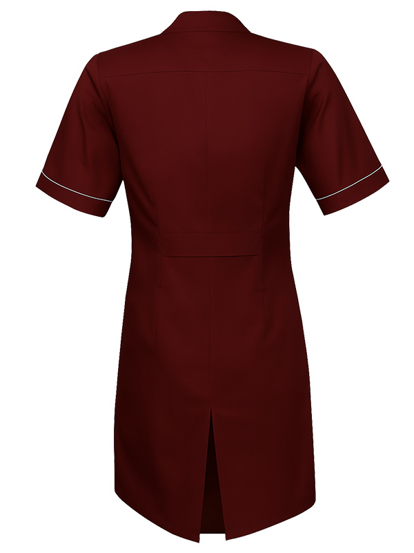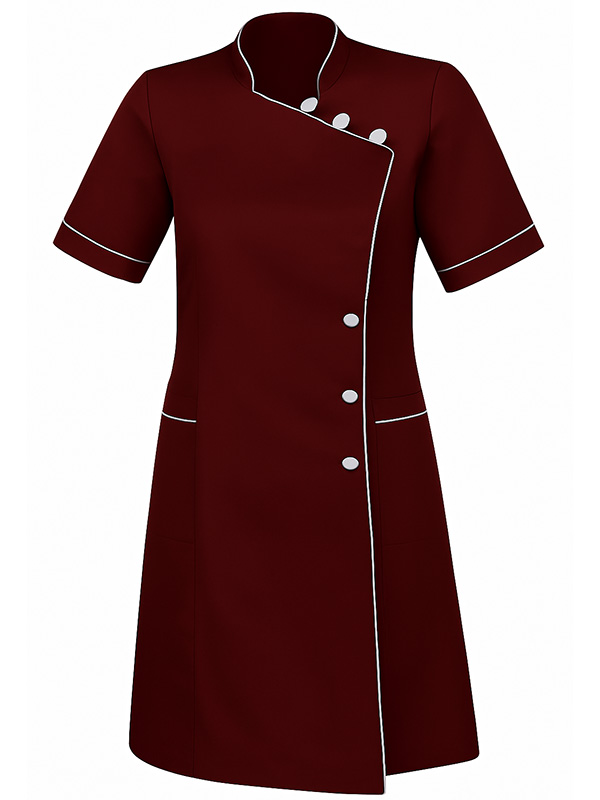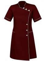Sukienka krótki rękaw, zapinana na trzy ozdobne guziki u góry i wzdłuż zapięcia oraz kryte springi. Wyróżnia ją asymetria przodów o charakterze orientalnym.
