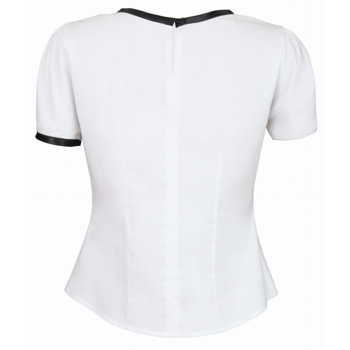 Bluzka damska, taliowana, zapinana z tyłu na 1 guziczek. Wykończona ozdobną, w kontrastowym kolorze lamówką w koło szyi i na rękawkach. Posiada ozdobną plisę z przodu.