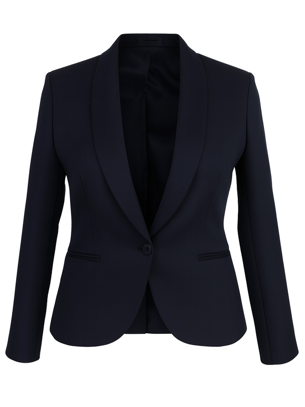 Żakiet damski na podszewce. Kołnierz szalowy, zapinany na 1 guzik, dwie kieszenie dolne. Lekko taliowany, zaokrąglony przód krótszy od tyłu, bez rozporków przy rękawach i z tyłu.
