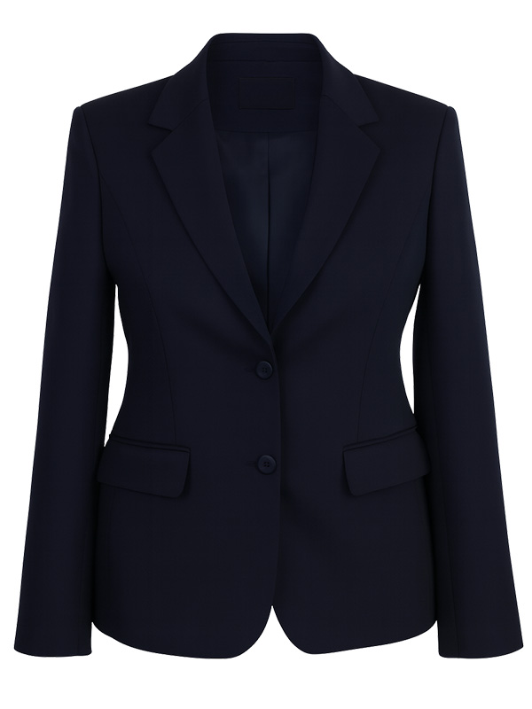Żakiet damski na podszewce. Kołnierz wykładany, zapinany na 2 guziki, dwie kieszenie dolne z patkami. Lekko taliowany, rozporek zakładany z tyłu. Skład tkaniny: z dodatkiem elastanu, mieszanka z wiskozą, wełną i 100% poliestru, do uzgodnienia.