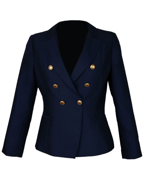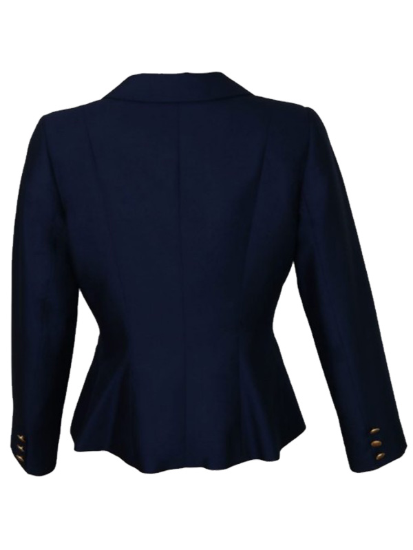Żakiet damski dwurzędowy, taliowany. Posiada wykładany kołnierz, dwie kieszenie dolne wykończone wypustką oraz ozdobne guziki na rękawach.