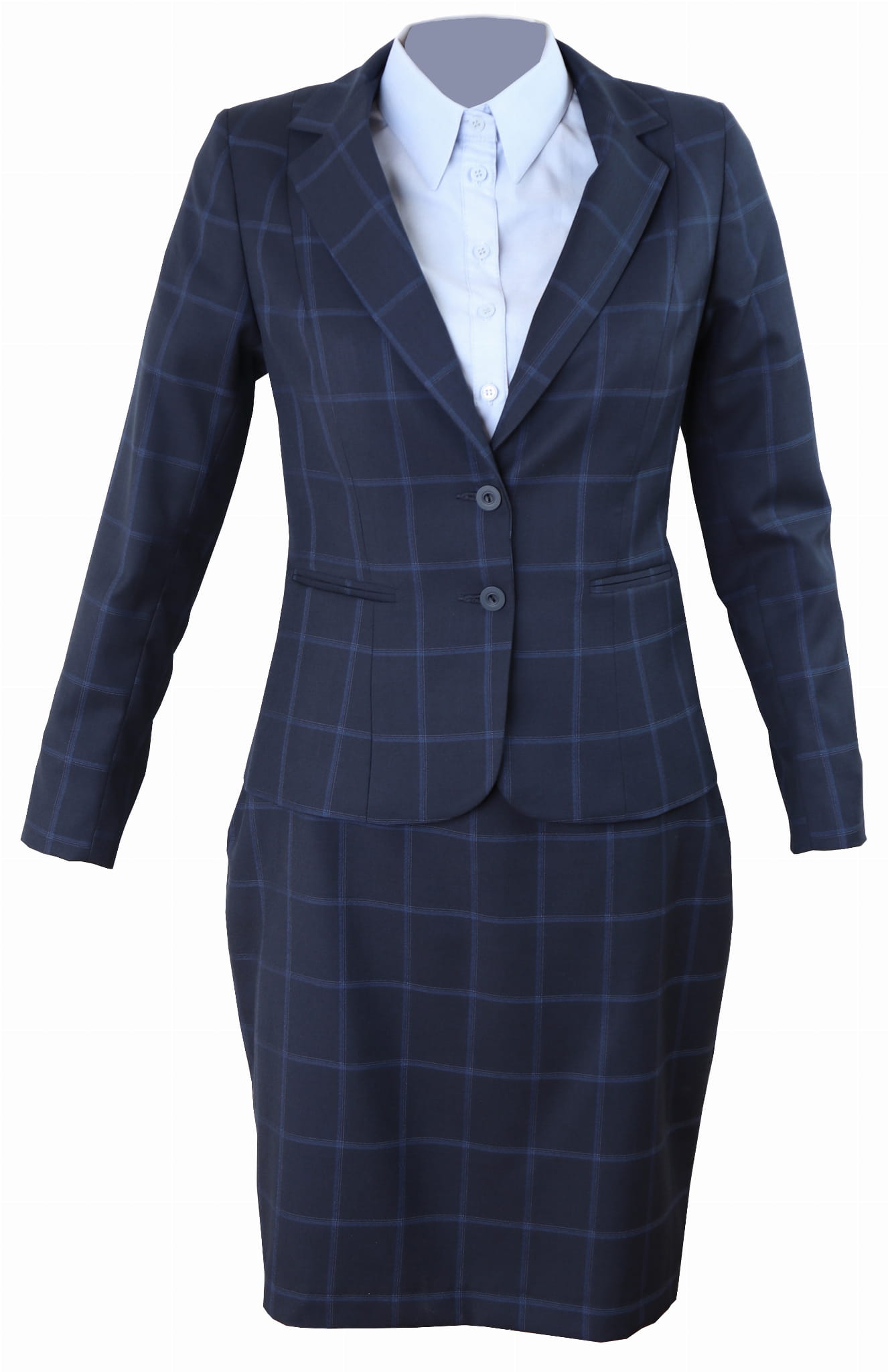 Zestaw damski w krat: żakiet, spódnica oraz błękitna bluzka.